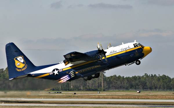Photo (courtesy US Navy) depicts Blue Angels “Fat Albert” C-130 support aircraft executing a JATO take-off at Pensacola NAS, Florida. |