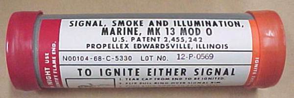 Mark 13 “day-night” flare. A pyrotechnic signaling device contained in many US Air Force and US Navy survival kits. The versatile Mark 13 has a “day” end that emits dense orange smoke when lit, and a “night” end that has a bright orange flare.