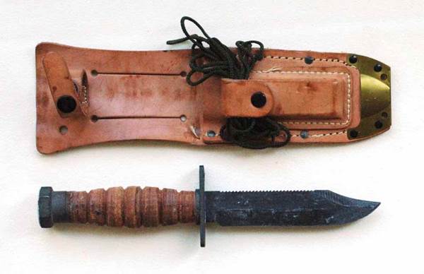 Survival knife, USAF and USN issue. This knife has a five-inch Parkerized blade with a saw-toothed back. Its handle is constructed of stacked leather washers, with a hexagonal hammer butt. It is normally issued with a leather sheath that contains a sharpening stone.